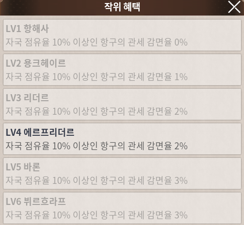 2. 4번째 작위는 모험 명성 44600, 교역 명성 44600, 전투 명성 44600 을 달성하면 왕궁에서 칙명을 받게 되는데 이 칙명을 하지 않는 방법입니다.